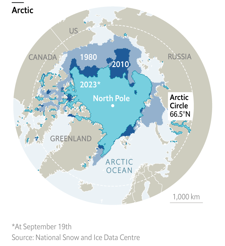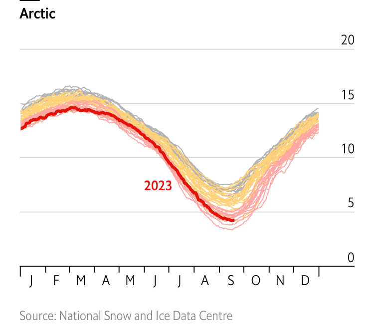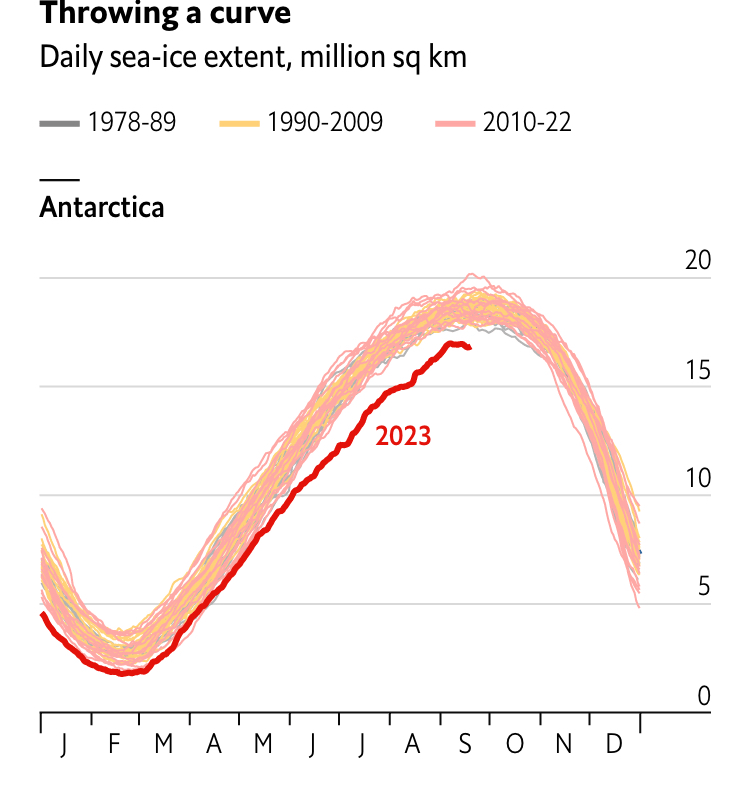 On September 7th Antarctica’s sea ice covered just short of 17m km, according to data tracking its daily extent from America’s National Snow and Ice Data Centre (nsidc). That is 1m sq km below its previous smallest annual maximum in 1986—an area equivalent to two Spains. Meanwhile, in the Arctic, where ice has been melting during the northern hemisphere’s summer, sea ice is at its sixth-lowest level since records began in October 1978.