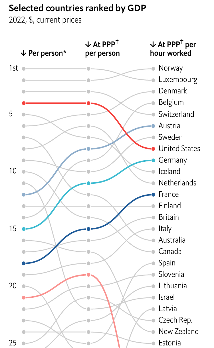 because of differences in holiday allowances, pensions and unemployment benefits, Europeans work less than Americans do. On an hourly basis, countries like Austria, Belgium and Denmark leap ahead. In France, Germany and Sweden productivity has also grown faster in the past ten years than it has in America.