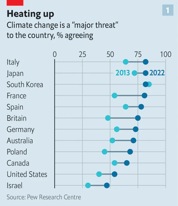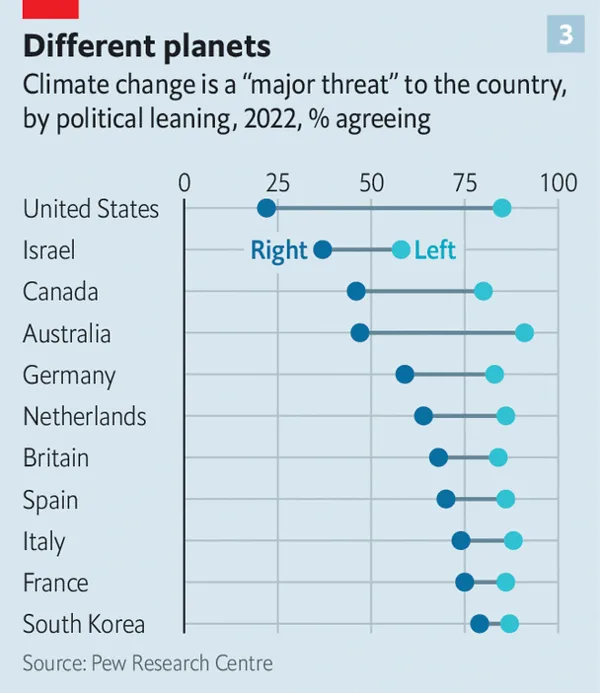 In all of the 14 rich countries surveyed by Pew in 2022, people on the political right were less likely to see climate change as a major threat than those on the left.