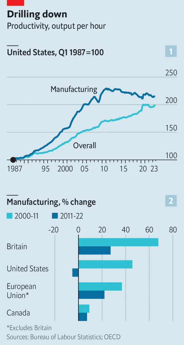 A better clue is provided by what went well in earlier decades. During the 1990s and 2000s manufacturing productivity soared, with the production of computers and electronics, especially semiconductor chips, leading the way. Gains seem to have topped out at around the time things went wrong more broadly, in the early 2010s. All told, more than a third of the overall slowdown in manufacturing since 2011 is accounted for by computers and electronics.