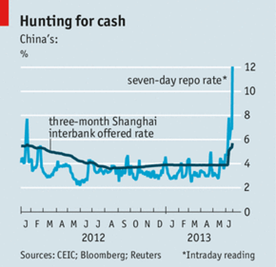 BANKS do not keep their doors open an extra half-hour just because their customers need more money. But when the banks themselves are short of cash, things are different. On June 19th China’s interbank market stayed open late as banks scrambled to borrow funds from each other. On June 20th the seven-day repo interest rate shot up to 12%, the highest on record (see chart). The Shanghai interbank offered rate (SHIBOR), an average of the rate at which big banks say they will lend, also rose.