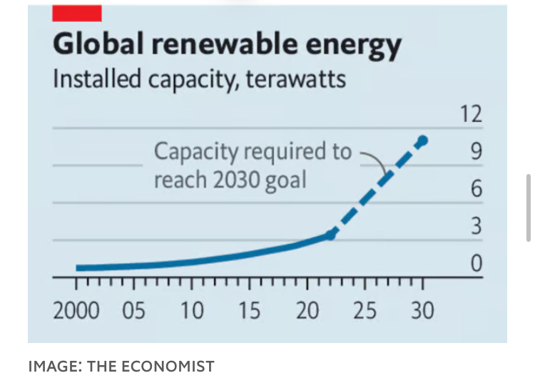 delegates from 118 countries have pledged to raise global renewable-energy capacity to 11,000 gigawatts (gw) by 2030, up from 3,400gw last year. But the task of adding roughly 1,000gw every year—almost as much as the entire generating capacity of America