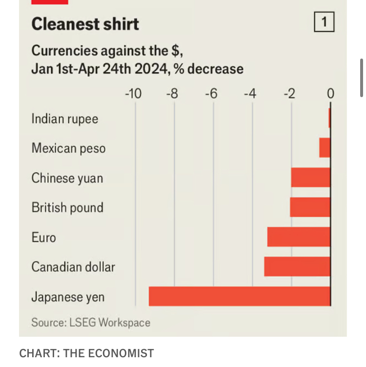 By the end of 2023, America’s economy was 8% larger than at the end of 2019. Those of Britain, France, Germany and Japan each grew by less than 2% during the same period. The yen is at a 34-year low against the dollar. The euro has dropped to $1.07 from $1.10 at the start of the year (see chart 1).