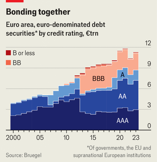 1999년 탄생 이래로 유로는 글로벌 지위를 노리는 경쟁자였습니다. 2007-09년 금융위기 직전까지 유럽 관료들은 유로가 시간이 지나면 달러와 경쟁할 수 있을 것이라고 기대했습니다. 그러나 2010년대 유로 위기가 닥쳤습니다. 유럽중앙은행(ECB)은 최종 대출자 역할을 수행하도록 설계되지 않았기 때문에 정부 채권이 유동성 위기에 취약해졌습니다. 유럽의 은행 시스템은 국가별로 분열되어 있었고, 불안정한 국가 부채와 더 불안정한 금융 기관을 연결하는 악순환에 취약했습니다. 자본 시장은 이러한 위험을 보상할 만큼 충분히 크지 않았습니다. 유로존은 현금을 보관하려는 투자자들에게 안전한 자산이 거의 제공되지 않았습니다: 채권 발행국은 독일의 경우 너무 인색했고, 이탈리아와 스페인의 경우 신뢰성이 부족했습니다. 전체 블록이 보증하는 공동 부채는 거의 존재하지 않았습니다. 어두운 경제 성장 전망은 단기 및 장기 금리를 제로 아래로 떨어뜨렸습니다. 유럽 자산이 낮은 수익률을 제공하자 유로에 대한 수요가 줄어들었고, 이 통화는 글로벌 역할도 상실했습니다.