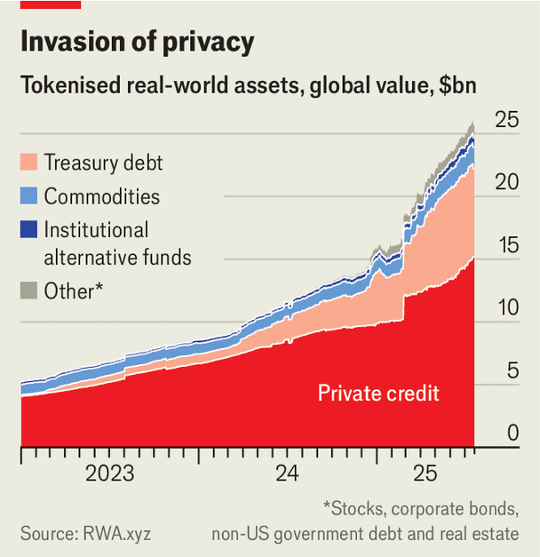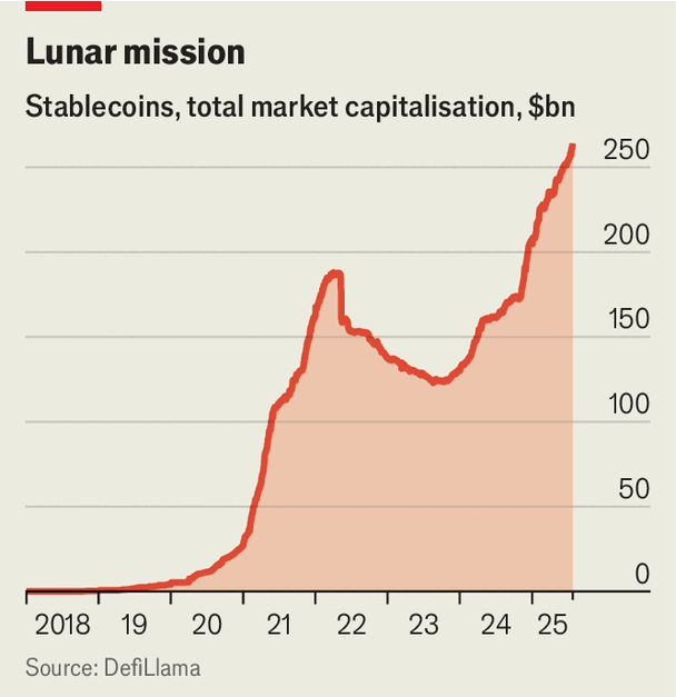 하지만 최근의 분위기는 다릅니다. 7월 18일 도널드 트럼프 대통령은 스테이블코인(보통 달러 자산으로 뒷받침되는 암호화폐 토큰)에 대해 내부자들이 오랫동안 갈망해 온 규제 확실성을 제공하는 지니어스법(GENIUS Act)을 법으로 제정했습니다. 업계는 호황을 누리고 있으며 월스트리트에서도 앞다투어 참여하고 있습니다. "주식, 머니마켓펀드, 심지어 사모펀드 지분과 부채까지 블록체인에서 거래되는 자산의 양이 급격히 증가하는 등 '토큰화'도 급부상하고 있습니다.