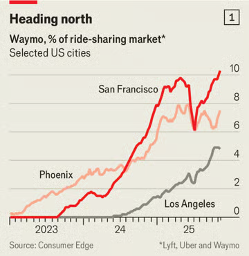 선도 도시들은 다른 지역에서도 예상되는 변화를 엿볼 수 있게 한다. 도로 안전은 개선될 것이다: 웨이모 차량은 일반 인간 운전자보다 심각한 사고 발생률이 10분의 1 수준이다. 적어도 지금까지 샌프란시스코에서는 택시나 카셰어링 운전자의 일자리 감소는 없었다. 이 차량들은 시장 최상위권에서 운영된다. 웨이모 차량 이용 요금은 평균적으로 차량 호출 서비스보다 약 3분의 1 정도 비싼데, 이는 회사가 사용하는 고급 재규어 차량과 회수해야 할 연구 비용을 반영한 것이다. 이용 비용에도 불구하고 로봇택시의 시장 점유율은 빠르게 상승 중이다(그림 1 참조).