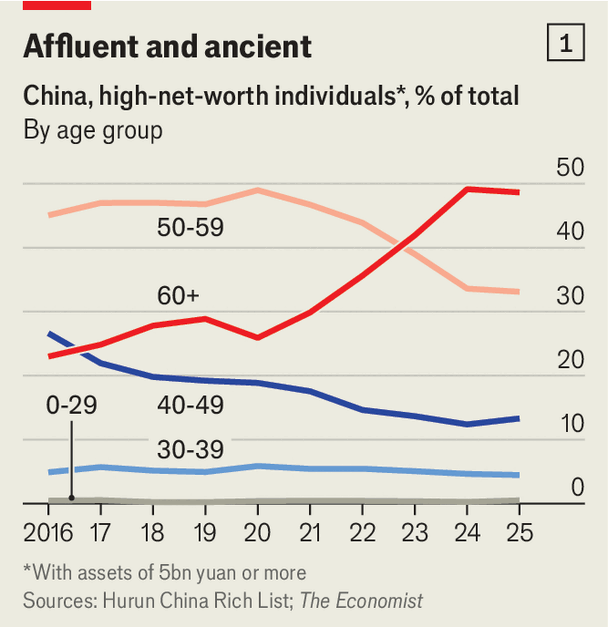 그 부의 거의 대부분은 상속받은 것이 아니다. 중국 본토 억만장자의 무려 98%가 자수성가한 반면, 홍콩은 66%, 대만은 69%에 그친다. 하지만 중국의 부는 점점 더 노년층의 손에 집중되고 있다. 리서치 기업 허룬(Hurun)의 데이터에 따르면, 2025년 기준 순자산 50억 위안(7억 2,000만 달러) 이상인 인구 중 60세 이상 인구가 49%를 차지했는데, 이는 2016년의 23%에서 증가한 수치다(차트 1 참조). 자산 정보 전문 기업 알트라타(Altrata)의 추산에 따르면, 2025년부터 시작되는 10년 동안 순자산 500만 달러 이상인 중국인들은 2조 1,000억 달러를 상속하게 될 것이다.