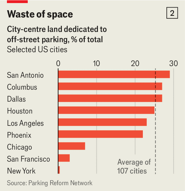 다음은 도시 지역에 미치는 영향이다. 주차 공간은 평균적인 미국 도시의 도심 면적의 4분의 1을 차지한다(차트 2 참조). 대부분은 주택이나 사무실 등으로 더 유용하게 활용될 수 있다. 노상 주차장은 승하차 구역이나 보도로 바뀔 수 있어 도시 산책이 더 즐거워질 것이다. 교통사고가 줄어들면 더 많은 도시민이 자전거를 탈 수 있다. 더 밀집되고 연결성이 향상된 도심은 경제적으로 큰 도움이 될 것이다.